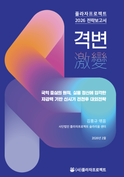 안녕하세요, 사단법인 플라자프로젝트입니다. 2026년 플라자프로젝트 연례보고서 「격변」을 회원 여러분께 공개합니다. 「격변」은 2022년부터 발간한 플라자프로젝트 연례보고서의 새 이름입니다. 이 보고서는 “자강”을 바탕으로 전략 사고를 전환해야 한다는 문제의식을 담았습니다. 또한 새 국제질서 형성에 대비해야 한다는 필요성을 제기합니다. 국익에 기반한 실용 전략을 추구하는 이재명 정부의 현재 전략과 정책 방향은 그동안 플라자프로젝트가 촉구해 온 내용과 놀라울 만큼 상응합니다. 이번 보고서는 플라자프로젝트 연구자들이 각자의 연구 영역에서 정리한 내용과 플라자프로젝트 세미나에 참여하며 정리한 생각도 함께 기록했습니다. 플라자프로젝트는 당파성을 넘어 국익의 관점에서 사고하려는 전문가들의 고민을 담고, 다양한 전문가의 글을 수록하기 위해 노력했습니다. 본 정책보고서는 회비를 납부하신 플라자프로젝트 정회원분들께 우편으로 발송드립니다. ▶ 정회원 가입 문의 조창영 간사 E-mail: plazaproject01@gmail.com (본 자료의 허가없는 무단 사용, 복제 및 재배포를 금합니다.) |